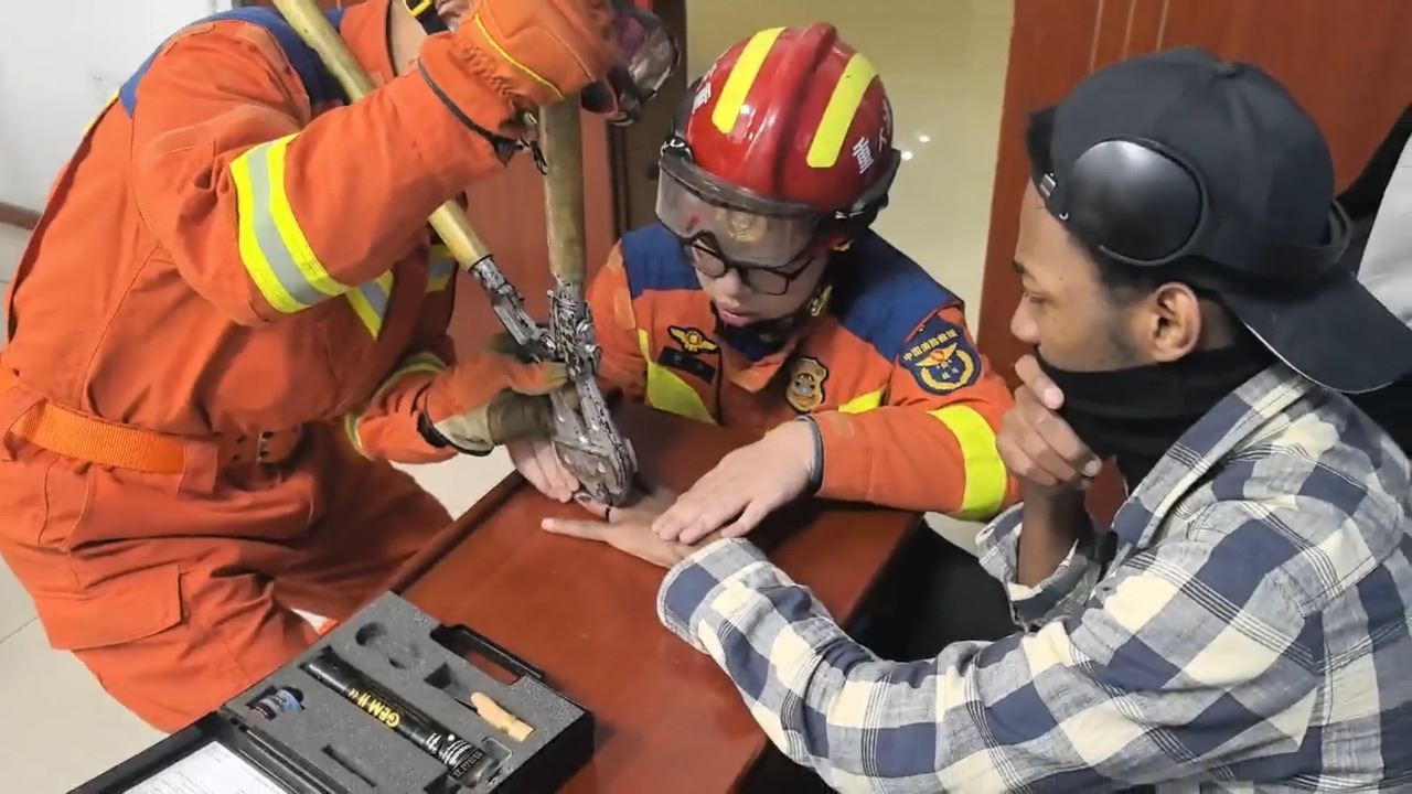 40964 次浏览 12-23日前,一名西南大学的外国留学生因戒指卡住手指无法取下,导致手指肿胀,在同学陪同下紧急前往北碚区城南消防救援站求助。消防员观察发现,一枚金属戒指紧紧卡在该留学生无名指关节处,因佩戴时间较长,手指已明显肿