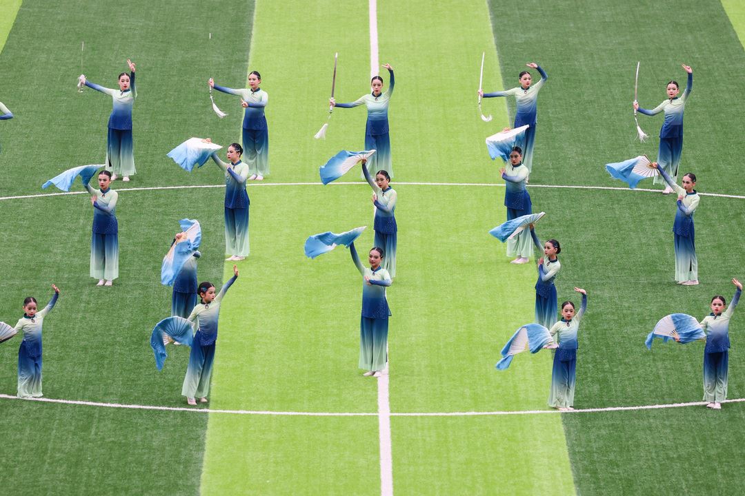 记者在现场看到,在球场中央,51 名身着飘逸舞服的少年静立如松,手中剑光凛冽,扇面如云。随着经典旋律《一条大河》悠然响起,少年们剑锋起落,若江河奔涌,气势磅礴;扇面开合,似山水蜿蜒,柔情万种。剑舞的飒爽刚劲与扇舞的飘逸柔美融为一体,犹如一幅流动的山水画卷。